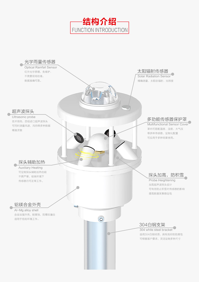 超声波气象站是一种采用紧凑和轻量化结构设计的微型气象站,它可用来测量多种重要气象参数,包括:风速,风向,大气压,温度,湿度,雨量,光照等。产品无活动部件,采用不锈钢外壳,具有良好的抗污染和抗腐蚀能力。可根据使用环境选择增加加热单元模块,有效去除雨雪冰冻的影响,能全天候全地域工作,精确测定并提供可靠数据,无需定期维护 。