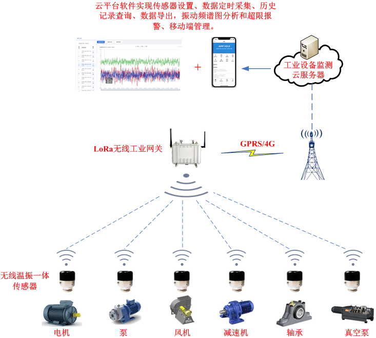 无线温振监测系统将关键设备上的传感器来收集设备状态数据,汇总至软件系统进行统计分析,然后进行设备状态的评估,对关键设备保养维修起到指导作用,有效解决关键设备管理中存在的问题从而使设备维修基础工作落到实处,为关键设备管理水平的提升打基础。符合标准 LoraWAN 标准协议,具有功耗低,抗干扰能力强,传输距离远的特性,适合工业现场使用。能够与符合 LoraWAN 协议的厂家网关匹配。超低功耗,睡眠下<25uA;工作发送电流 30~150mA(可配置)。可根据现场距离和阻隔情况,有 8 个发射功耗挡位可设置三轴振动智能传感器既具备普通振动传感器的振动数据采集、A/D数据转化的功能,又具备将其采集的振动数据信息进行处理、存储、无线传输的功能,其较传统的测振仪、振动传感器其优势主要体现于测振传感器、三轴振动智能传感器在智能化方面的表现主要体现于:物联网、5G通信、智能云、嵌入式软件技术等新技术在三轴振动智能传感器的应用更使其智能化优势充分拔高,因此三轴振动智能传感器在工业精确制造、城市工程、爆破工程、交通工程、军工试验等领域的生产作业和试验现场中广泛使用。