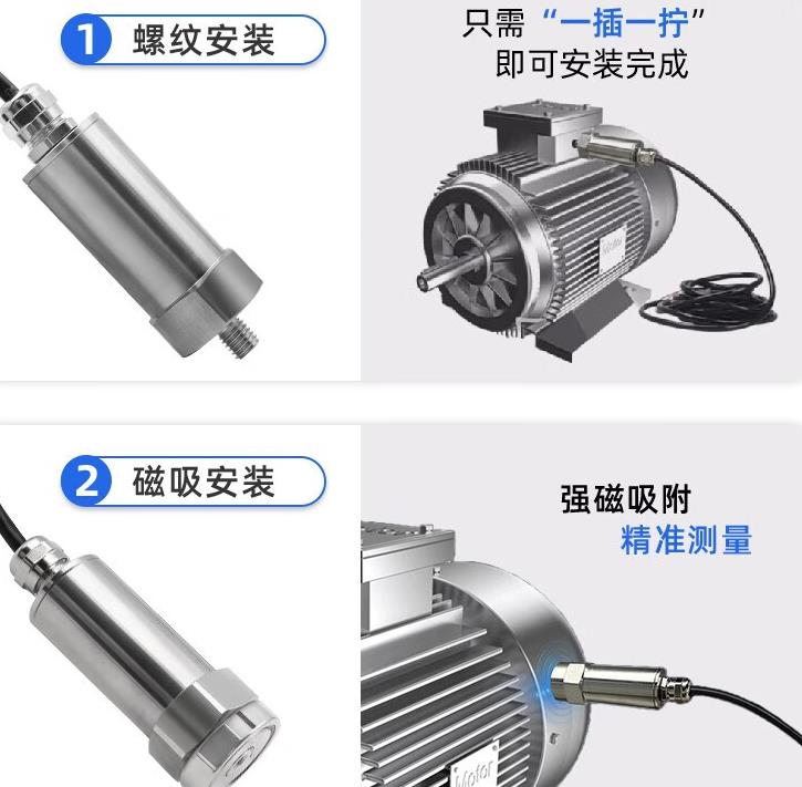 螺纹安装:监测设备需要打孔,传感器的默认螺纹 M5 螺柱,是需要和被测设备进行螺纹连接的。