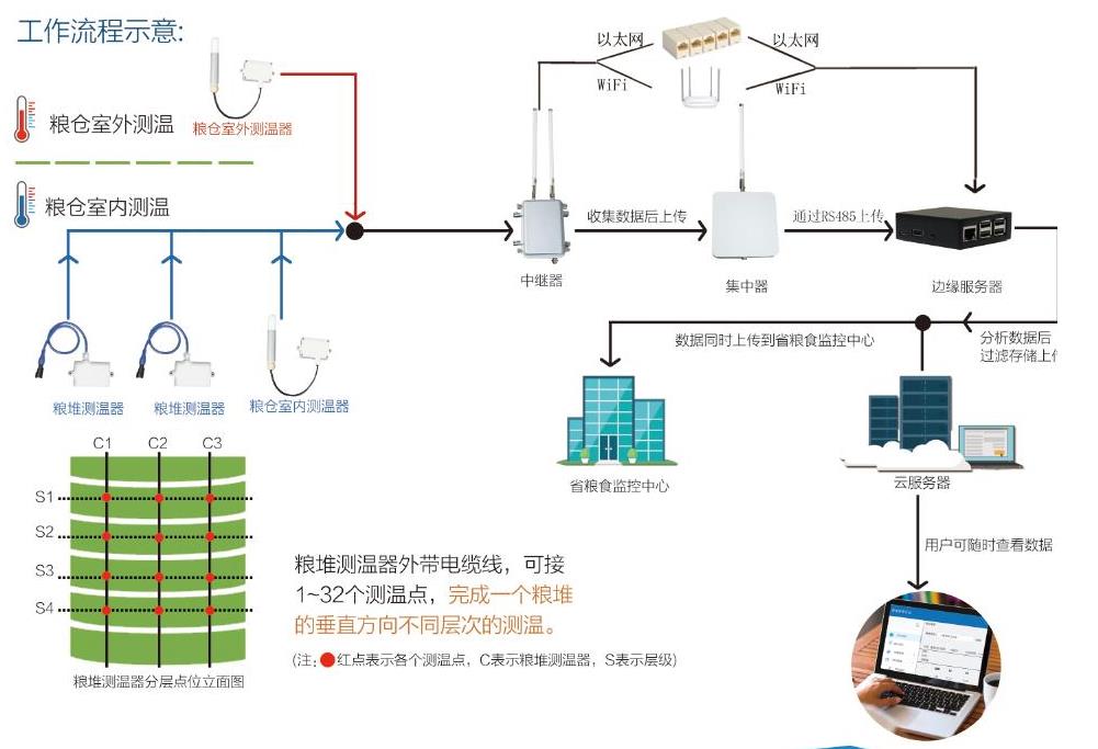 基于LORA无线通讯技术的粮库温度监测方案,是一款基于LORA无线通讯的的粮仓粮堆温度监测系统,它主要由LORA无线测温探杆、监控主机和粮仓远程管理平台三部分组成。