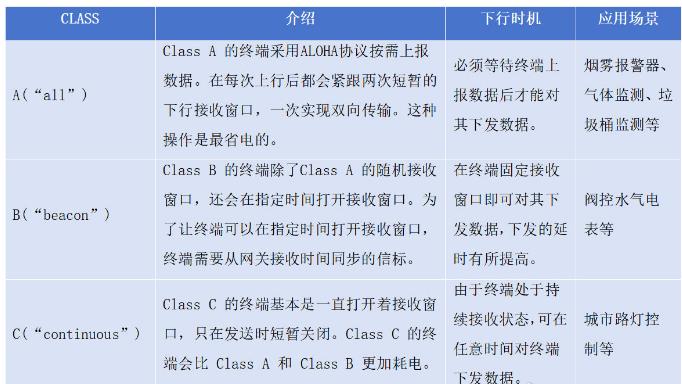 LoRaWAN规范定义了三种设备类型:A类、B类和C类,这三类设备基本上能覆盖物联网所有的应用场景。所有LoRaWAN设备都必须实现A类,而B类和C类是A类设备规范的扩展,所有设备类别都支持双向通信(上行链路和下行链路)。