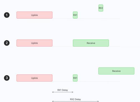 服务器可以在第一个接收窗口(RX1)或第二个接收窗口(RX2)期间响应,但不同时使用这两个窗口。让我们考虑下行链路消息的三种情况,如下图所示。