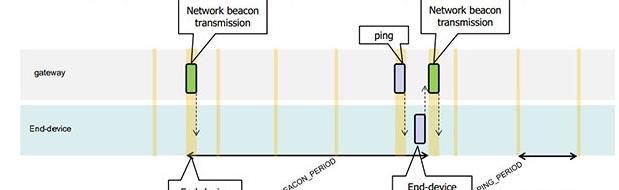 除了A类启动的接收窗口外,B类设备还会打开计划的接收窗口,以接收来自网络服务器的下行链路消息。通过使用网关传输的时间同步信标,设备在预定时间开启接收窗口。两个信标之间的时间间隔被称为信标周期。设备在预定时间打开下行链路“ping插槽”,以便接收来自网络服务器的下行链路消息。此外,B类设备在发送上行链路后也会打开接收窗口。