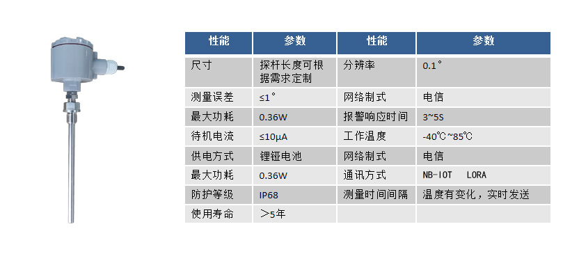 选用高精度、高稳定性的探杆式温度检测仪,其主要参数如下: