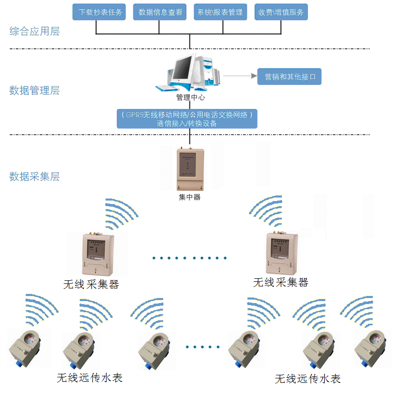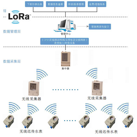 Lora无线远传水表为计量基础,通过微功率免申请计量频段(470~510MHz)与采集器集中器进行通信,数据上传到集中器上,由集中器统一通过GPRS模块与主站通信将数据上传到主站,实现水表使用水量的自动远程抄表,支持双向通信,可实时开关阀,实时点抄,表端正常处于低功耗模式,当集中器下发抄表命令后,指定地址的水表唤醒,进行抄表,完毕后继续进入低功耗,有效地降低了表端功耗。本产品还具备阀门控制功能(可选),方便管理部门对水表的用水情况进行控制,使得远程抄表及控制变得更便捷。可靠,在节约人力、物力和财力的同时,有效地提高了生产效益。
