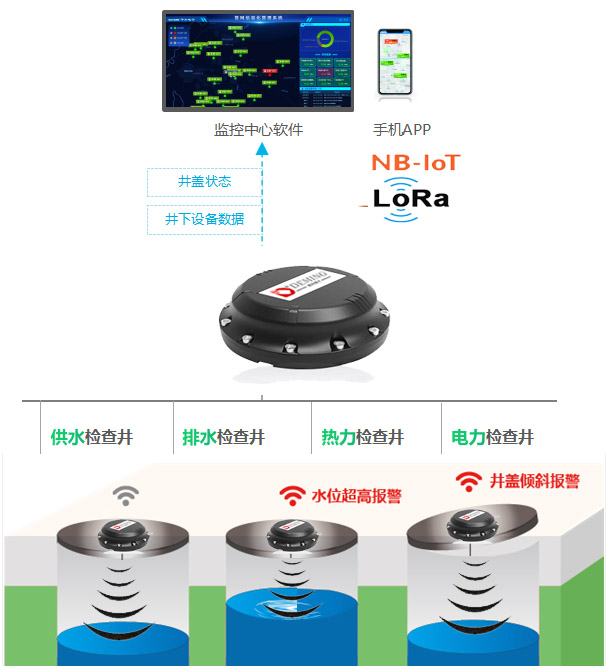 智慧井盖管理系统,可应用于供水、排水、热力、电力等各类地下智慧管网管理系统,是各类智慧管网管理系统中不可或缺的重要设备,解决了井下监测环境潮湿易水淹、电力供应困难、通讯不畅等难题, 适合安装于城市主干路、住宅小区、人行道、非机动车道、停车场等区域的窨井。智慧井盖管理系统帮助监管人员及时发现管网和井盖异常,以便快速采取措施,避免事故或灾害的发生,减少人员及财产损失。智慧井盖管理系统,可应用于供水、排水、热力、电力等各类地下智慧管网管理系统,是各类智慧管网管理系统中不可或缺的重要设备