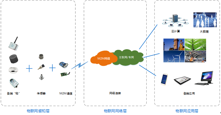 物联网主要由感知、传输(网络)和应用三个部分组成,如下图: